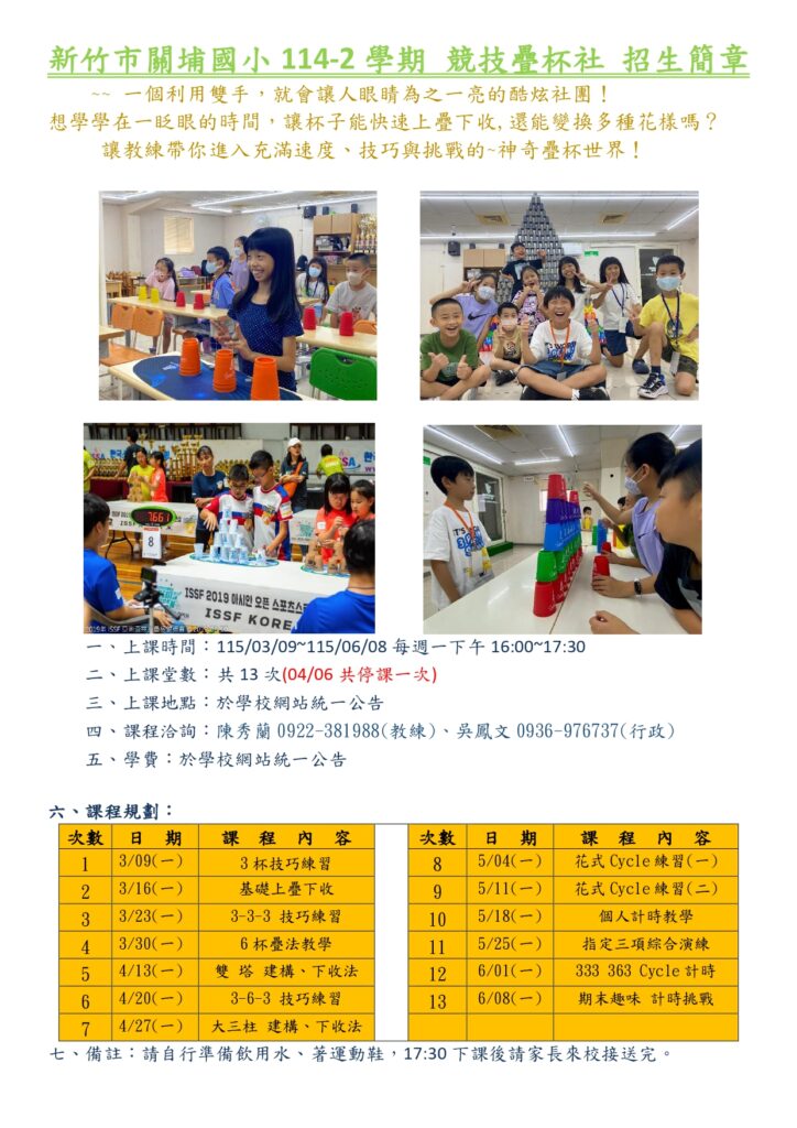 11.競技疊杯社 現在非登記時間,第二階段登記時間為「3/2(一)08:00起至3/4(三)12:00止」 想再看看更多其他我們規劃的多元課程嗎 回到課程列表 admin 10.烏克麗麗進階班 12.181爵士鼓社