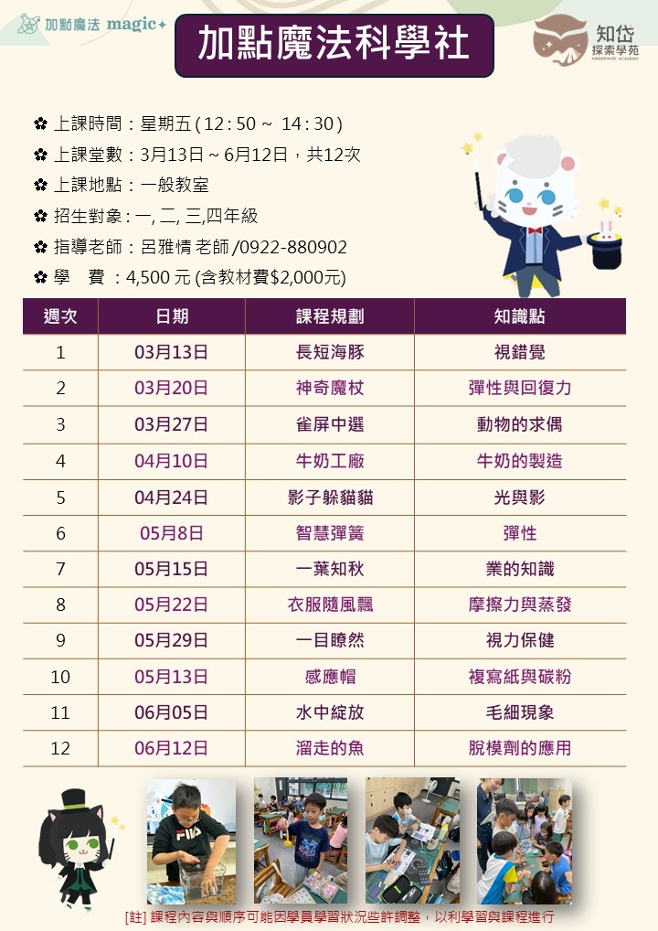 15.加點魔法科學社 現在非登記時間,第二階段登記時間為「3/2(一)08:00起至3/4(三)12:00止」 想再看看更多其他我們規劃的多元課程嗎 回到課程列表 admin 13.玩樂初級小提琴團班 16.科學動手玩
