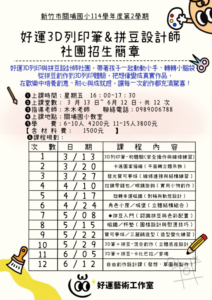 18.好運3D列印筆&拼豆設計師 現在非登記時間,第二階段登記時間為「3/2(一)08:00起至3/4(三)12:00止」 想再看看更多其他我們規劃的多元課程嗎 回到課程列表 admin 14.玩樂初級鍵盤團班