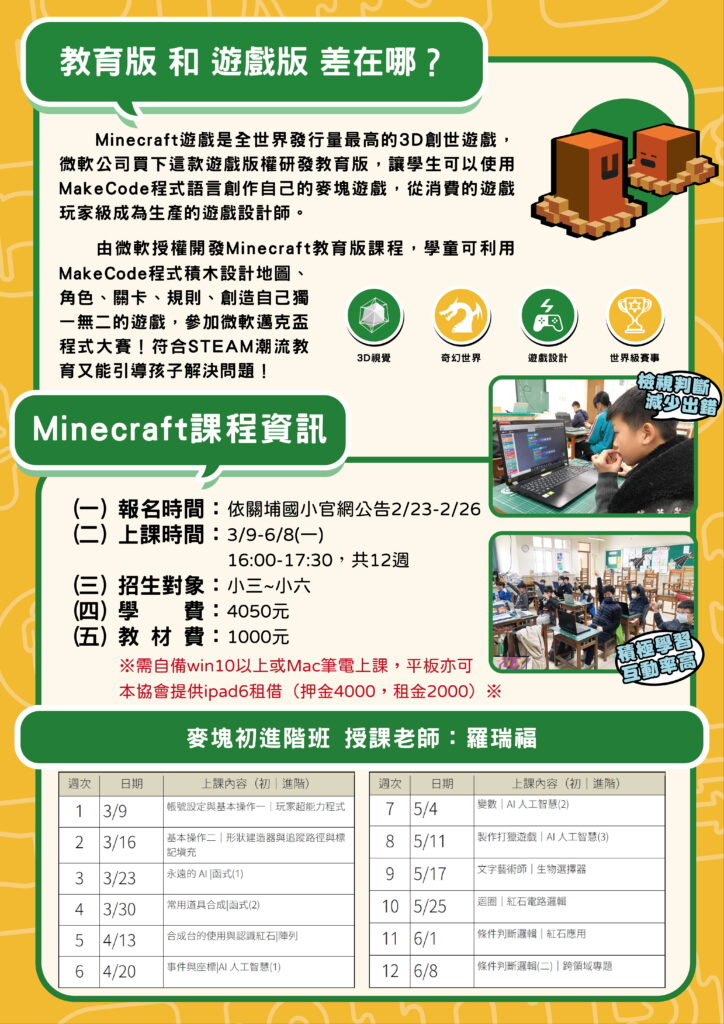 21.創世貓麥塊教育版程式初進階班 現在非登記時間,第二階段登記時間為「3/2(一)08:00起至3/4(三)12:00止」 想再看看更多其他我們規劃的多元課程嗎 回到課程列表 admin 20.JoJo未來科學 機器人遊樂園B 22.創世貓麥塊教育版程式高手班