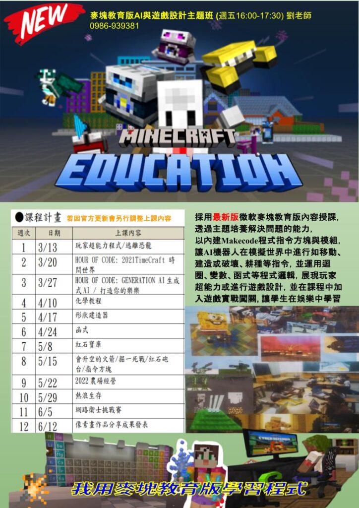 26.麥塊教育版AI與遊戲設計主題班 現在非登記時間,第二階段登記時間為「3/2(一)08:00起至3/4(三)12:00止」 想再看看更多其他我們規劃的多元課程嗎 回到課程列表 admin 25.Scratch小小遊戲設計師 27.我的世界-程式暨樂高設計社