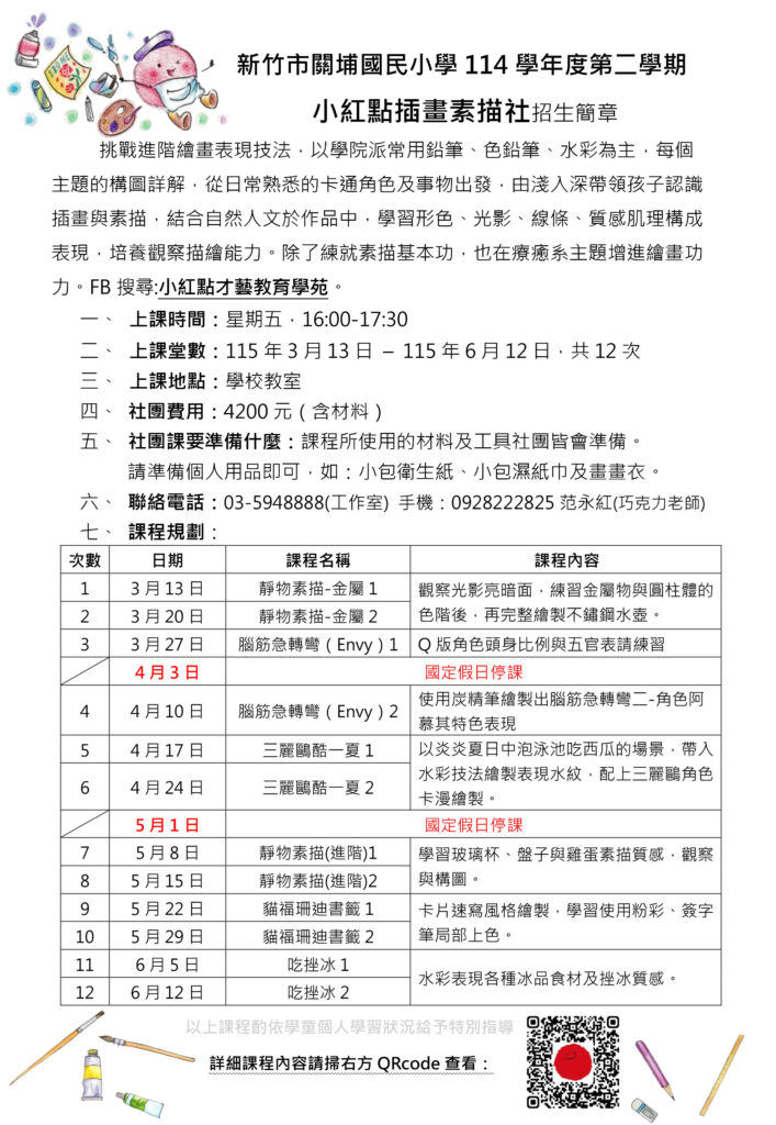 30.小紅點插畫素描社 現在非登記時間,第二階段登記時間為「3/2(一)08:00起至3/4(三)12:00止」 想再看看更多其他我們規劃的多元課程嗎 回到課程列表 admin 29.點點老師-進階繪畫社 31.小紅點創意美術社