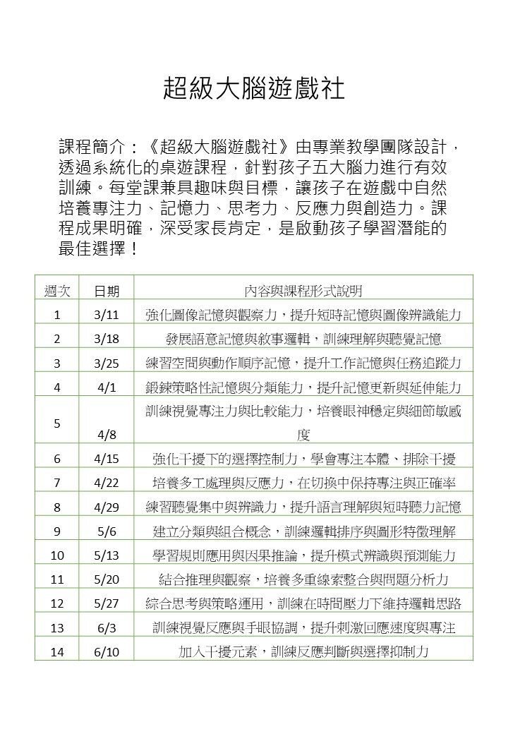 35.超級大腦遊戲社 現在非登記時間,第二階段登記時間為「3/2(一)08:00起至3/4(三)12:00止」 想再看看更多其他我們規劃的多元課程嗎 回到課程列表 admin 34.創意魔術社B 36.皮課思 Talk Show